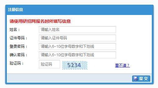 考生登录网址http://61.166.241.249:8000/ASPX/Student/StuLogin.aspx,点击“注册”按钮填写注册信息,所填写信息须与“中国研究生招生信息网”研招报名时填报信息一致,否则将无法注册登录。注册信息填写完成后点击提交,系统自动跳转到登录页。