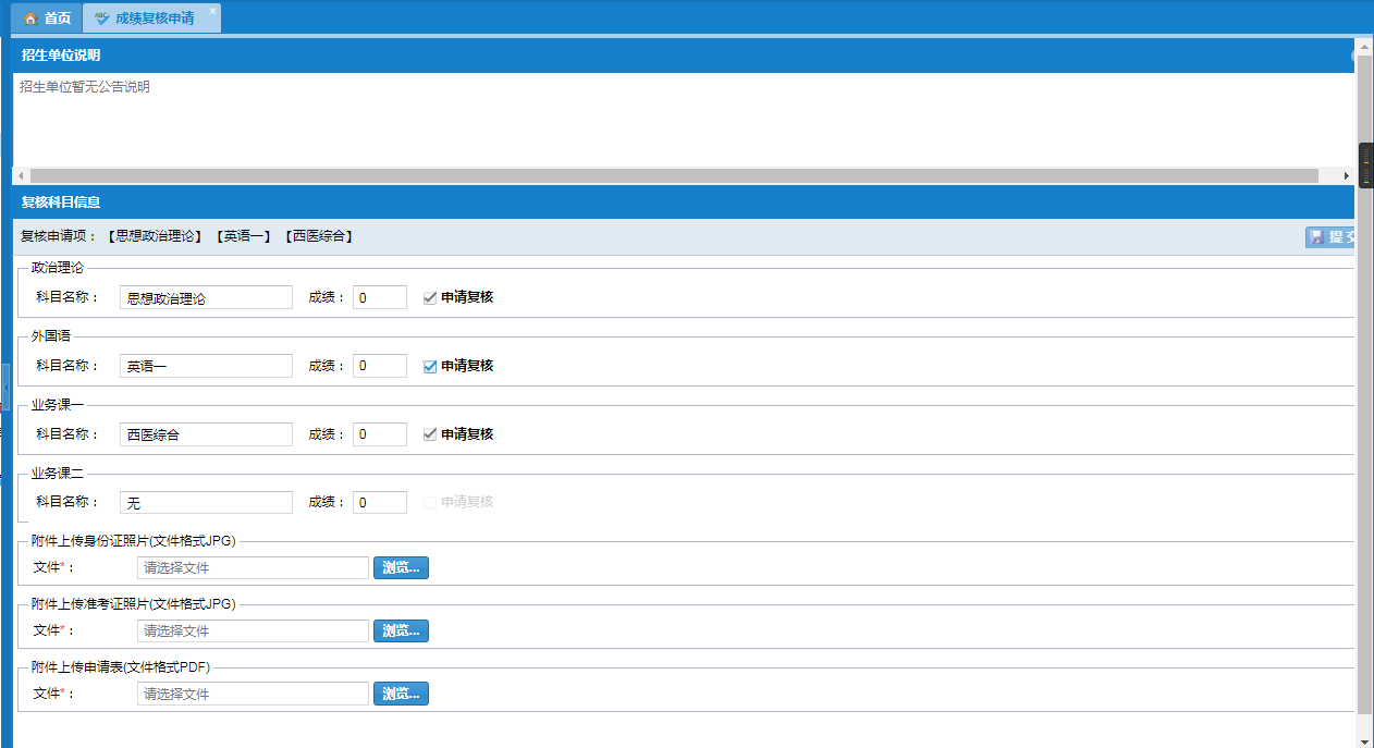 考生进入系统后双击左侧功能树中“成绩复核申请”,选择需申请复核科目,同时上传成绩复核申请表(PDF格式)、身份证照片或扫描件(JPG格式)、准考证照片或扫描件(JPG格式)。三个文件必须按要求的格式上传,缺一不可,否则不可提交。